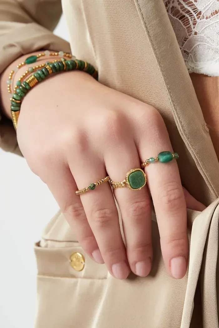 Hoe tof is deze elastieken gouden ring met drie witte stenen! Superleuk om deze ring te combineren met meerdere gouden ringetjes of witte sieraden! De ring is perfect voor een feestelijke gelegenheid en kan door het elastiek makkelijk aan elke vinger gedragen worden! De ring is gemaakt van hematiet, kristalkralen en white jade.