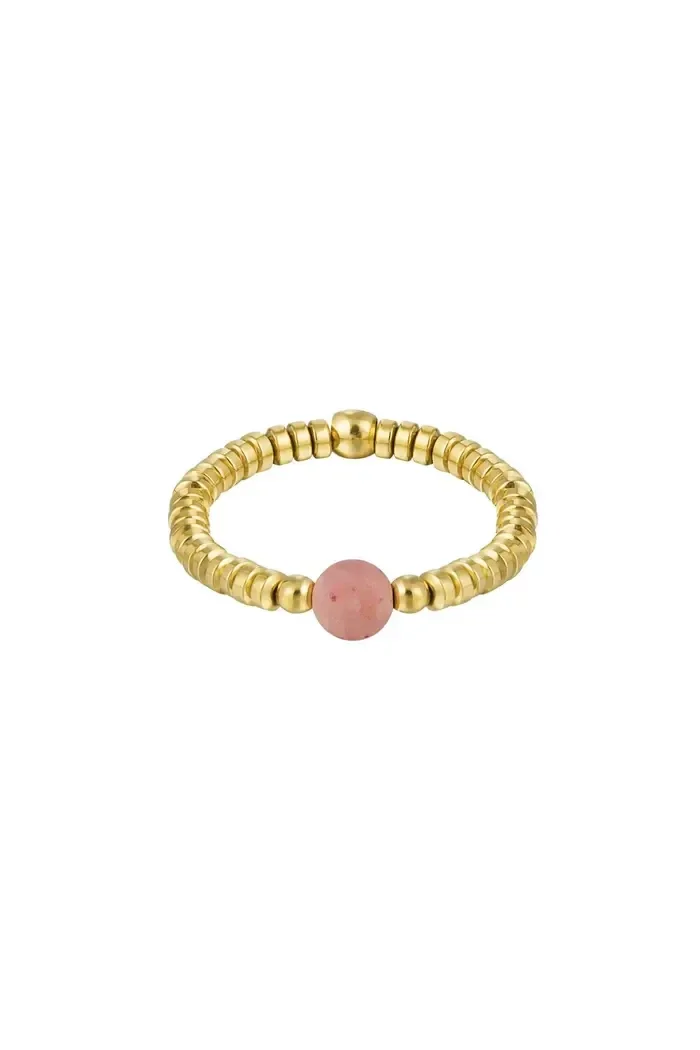 Hoe tof is deze strech gouden ring met roze grote steen. De ring beschikt over kleine kraaltjes waardoor er een speels effect wordt gecreëerd. De ring is perfect te combineren met meerdere ringen. Ook leuk om deze ring met meerdere roze sieraden te combineren voor een toffe look! De ring is gemaakt van hematiet in combinatie met Rozenkwarts.