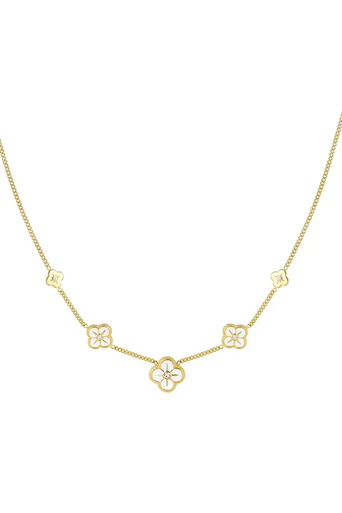 Hoe leuk is deze gouden ketting met vijf klavers met steentjes! Mega trendy en perfect te combineren met meerdere leuke kettingen! De ketting is daarnaast superleuk te combineren met meerdere kleurrijke sieraden en accessoires. De ketting is gemaakt van stainless steel, enamel en strass steentjes. De ketting heeft een verstelbare lengte vanaf 38,5 tm 43,5.